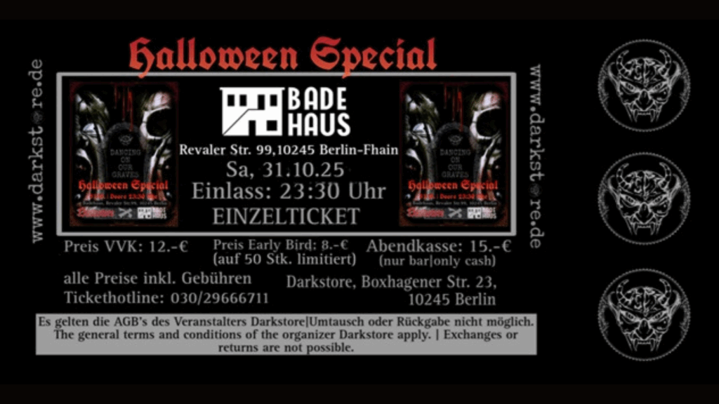 Es gelten die AGB´s des Veranstalters Darkstore. Umtausch oder Rückgabe nicht möglich.