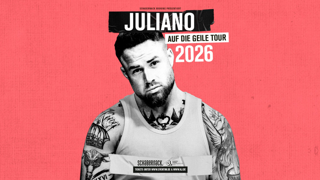Er ist der absolute Senkrechtstarter der Mallorca- und Partywelt! Mit millionenfach gestreamten Hits wie “Assi aber geil”, “Boomerang (Malle Fieber)”, “Du findest uns im Club” und seiner brandneuen Single “Intro” ist Juliano zum meistgehörten Newcomer der Partyszene avanvciert. Sein Soundkosmos, irgendwo zwischen Finch, Tream, Die Atzen, Mickie Krause und 50 Cent angesiedelt, beamt jeden im Publikum sofort aus allen Alltagssorgen – deshalb gibts nur eins: Goldkette um, Sonnenbrille auf, Adiletten an – und mitfeiern! Denn die Sause des Jahres kommt im Mai 2026 nach Hamburg, Dortmund, Köln, Berlin, Leipzig, München, Stuttgart und Frankfurt