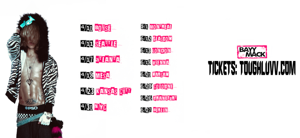 Bayymack, gehört zu den spannendsten Stimmen der neuen Hyperpop- und Club-Underground-Generation. Mit seinem Projekt tough luvv hat er sich in den letzten Jahren als eine zentrale Figur einer Szene etabliert, die Pop, Internetkultur und Clubsound radikal neu denkt.