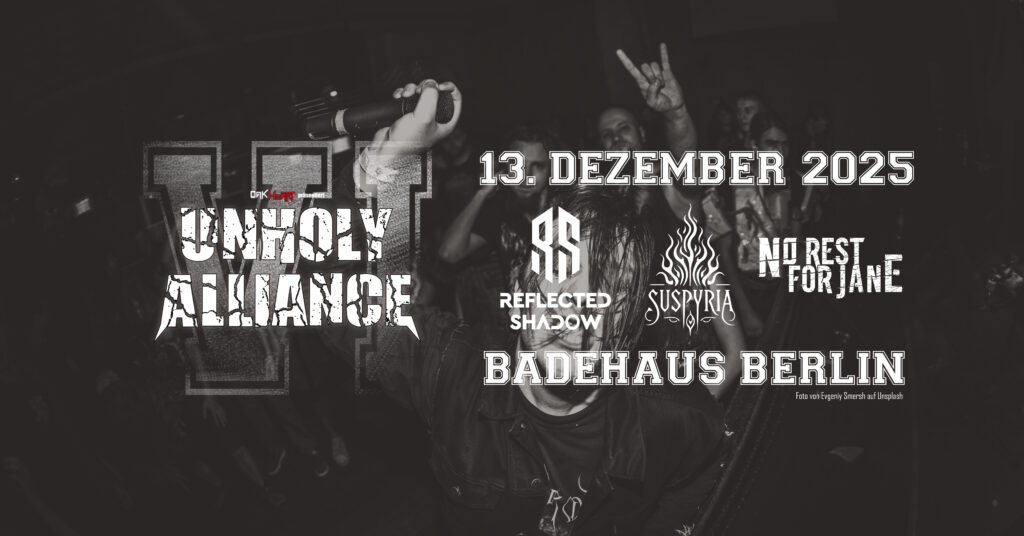 Am 13. Dezember 2025 ist es wieder soweit: Die Unholy Alliance kehrt zurück ins Badehaus Berlin – laut, intensiv und kurz vor Weihnachten! 🎄🤘